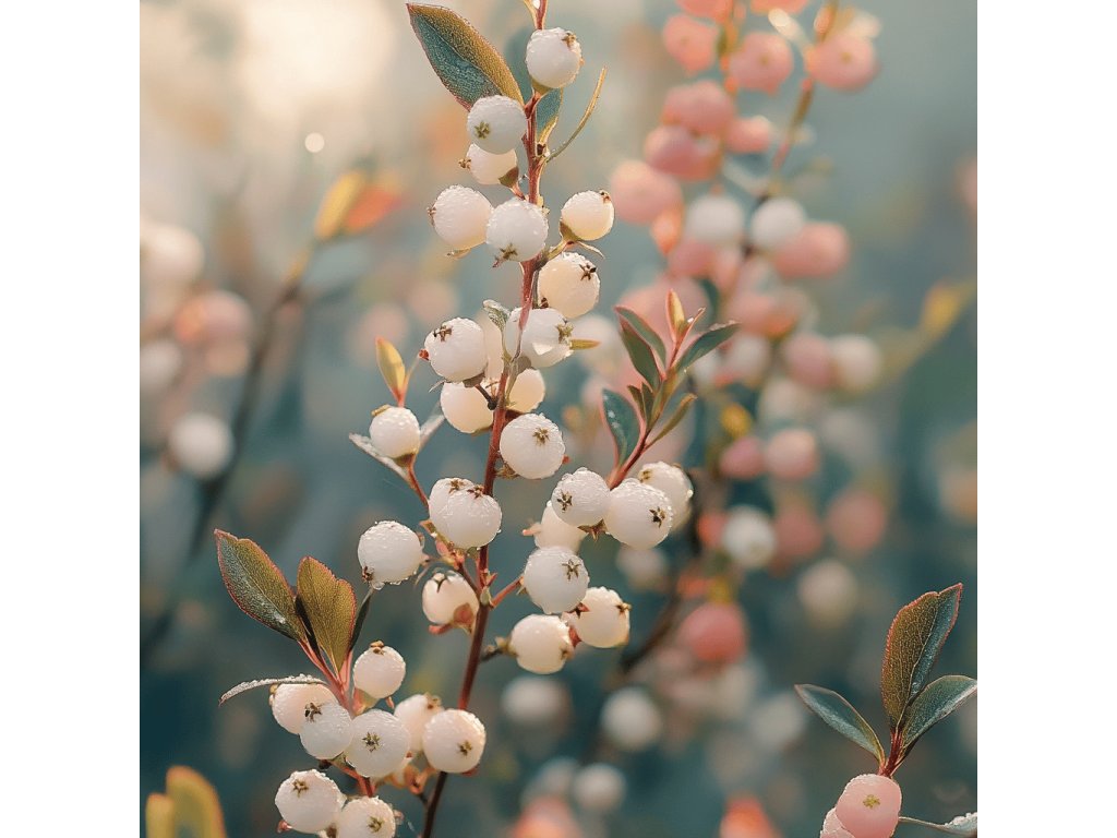 - Plody 🍎: Bílé kulovité bobule, zrají na podzim a zůstávají na keři až do zimy