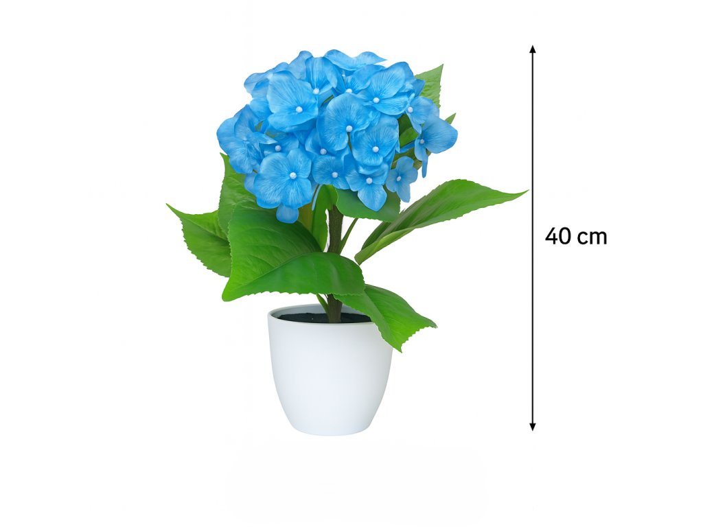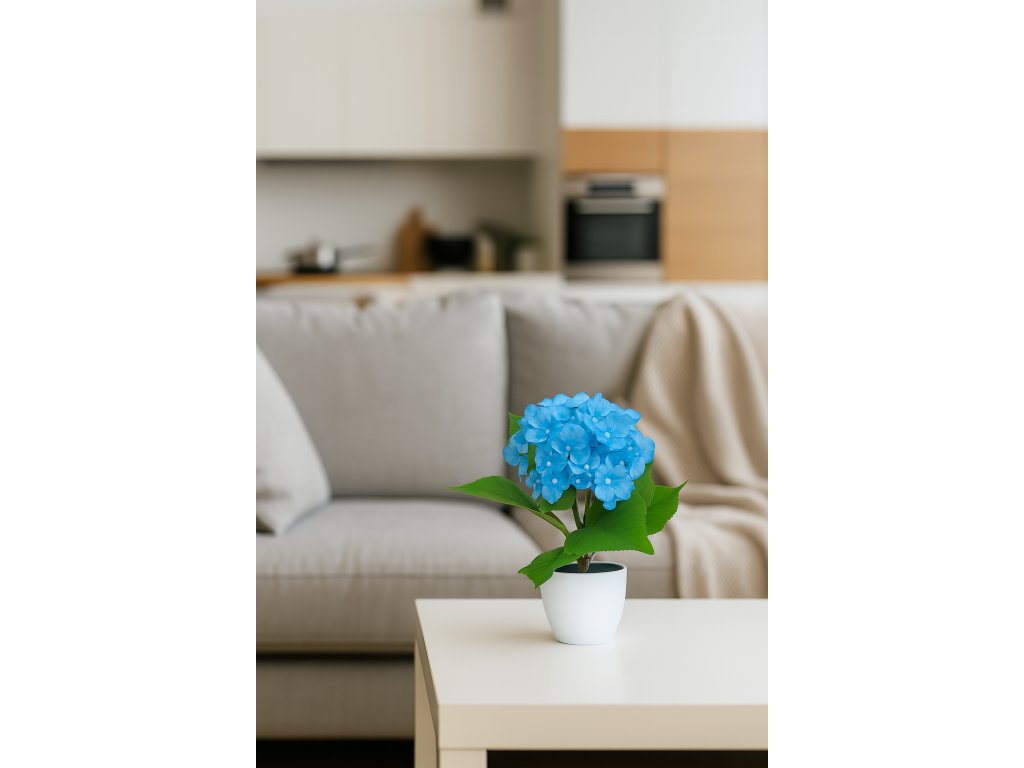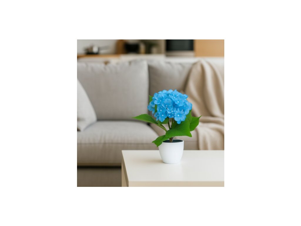 Modrá hortenzie v květináči – realistická umělá květina pro interiérovou výzdobu