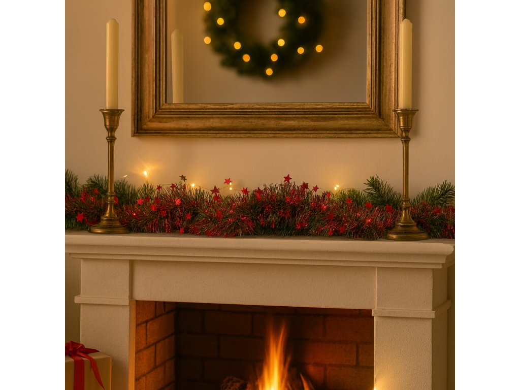 Tradiční vánoční girlanda v kombinaci zeleného jehličí a červených hvězdiček. Plastové jehličí je doplněno o drobný lesklý posyp a tvoří bohatý svazek, který vypadá přirozeně a dekorativně. Délka 2 m umožňuje využití v různých aranžmá – na krbové římse, okenním parapetu i zábradlí.