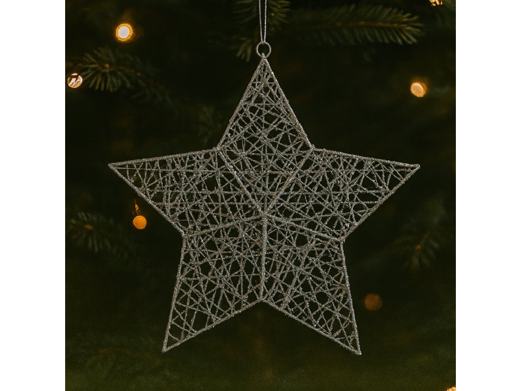 Tato stříbrná vyplétaná vánoční hvězda o průměru 30 cm je výrazným doplňkem pro zimní období. Díky kovové konstrukci a třpytivému povrchu působí elegantně a moderně. Hodí se jako závěsná dekorace do interiéru, na okna i na stěnu, kde rozzáří sváteční atmosféru.