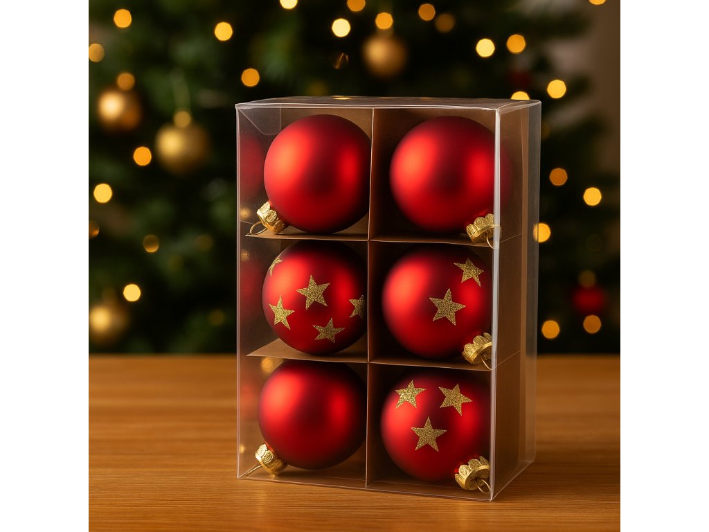 Sada skleněných vánočních koulí červené se zlatými hvězdami