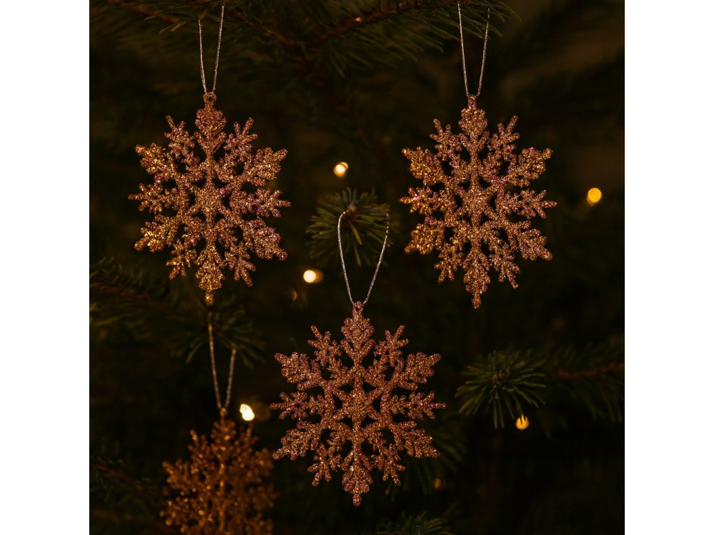 Vánoční ozdoby v podobě vloček v měděné barvě s bohatým třpytivým povrchem. Jsou lehké, vyrobené z plastu, a opatřené stříbrnou bavlnkou pro zavěšení. Díky univerzálnímu odstínu ladí s tradičními i moderními barevnými kombinacemi. Balení obsahuje 4 kusy.