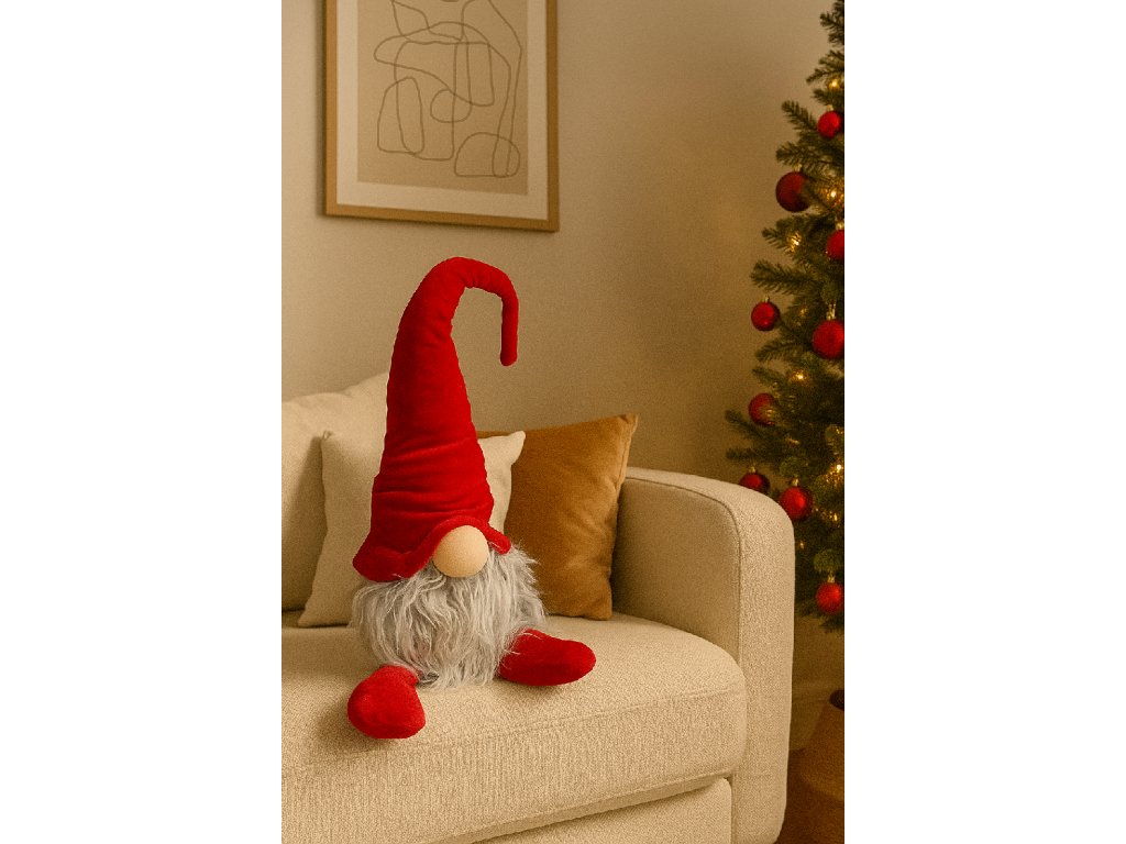 Vánoční skřítek s dlouhou červenou čepicí – dekorace v severském stylu