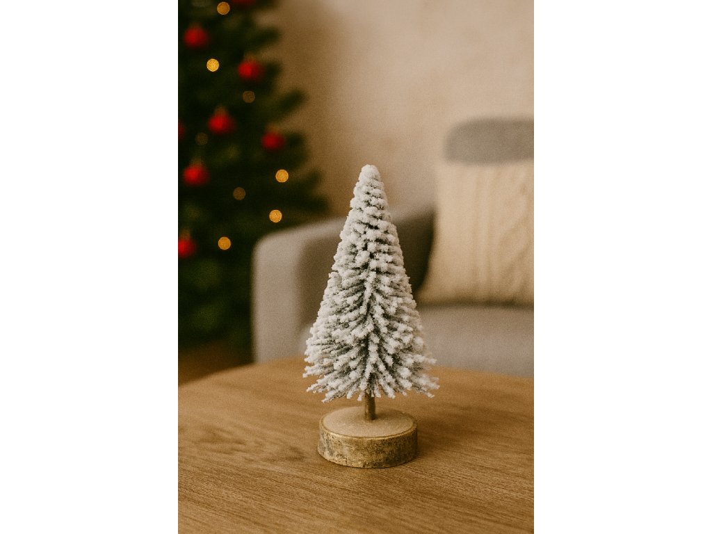 Tento malý zasněžený stromek v kulatém dřevěném jakoby květináči působí přirozeně a útulně. Jehličí má jemný poprašek sněhu, který vytváří zimní atmosféru. Díky své velikosti se hodí na stůl, komodu, poličku i do menších dekorativních aranžmá. Vynikne samostatně nebo v kombinaci s dalšími vánočními ozdobami, například svícny, soby nebo andílky.