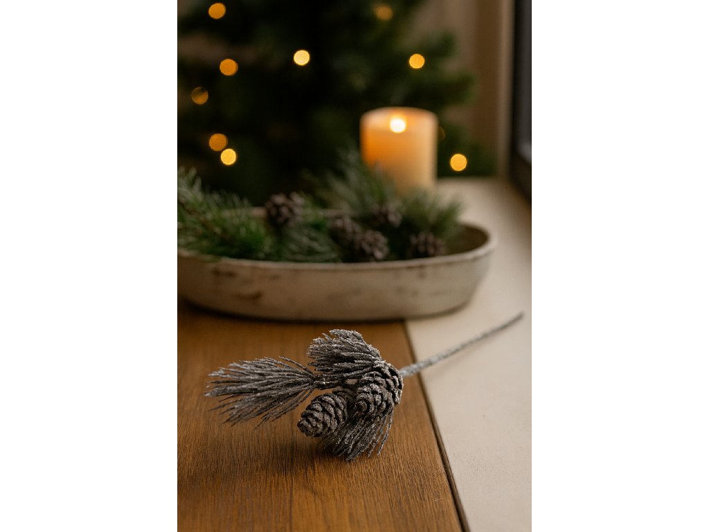Tato vánoční větvička borovice v hnědostříbrném tónu je univerzálním doplňkem pro vaše sváteční dekorace. Hodí se do váz, věnců, svícnů i jako součást stolních aranžmá. Díky plastovému provedení je lehká, odolná a snadno se kombinuje s dalšími přírodními i umělými dekoracemi. Jemný lesk stříbrného tónu dodává větvičce slavnostní vzhled.
