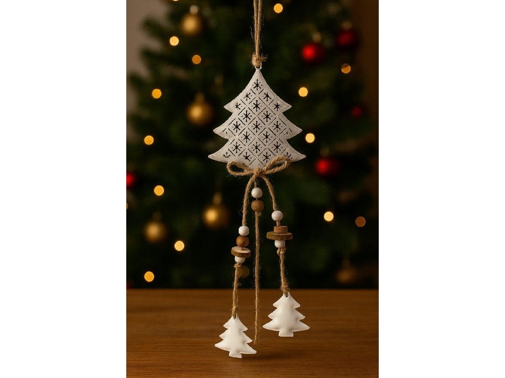 Tento závěsný stromek kombinuje kovovou siluetu stromu s jemným dekorem, přírodní sisal a dřevěné prvky včetně dvou menších stromečků na šňůrkách. Dekorace působí rustikálně a přitom elegantně, takže se hodí jak do moderního interiéru, tak do tradiční chalupy. Díky délce 54 cm je výrazným prvkem výzdoby, který ozdobí dveře, stěnu i prostor v okně.