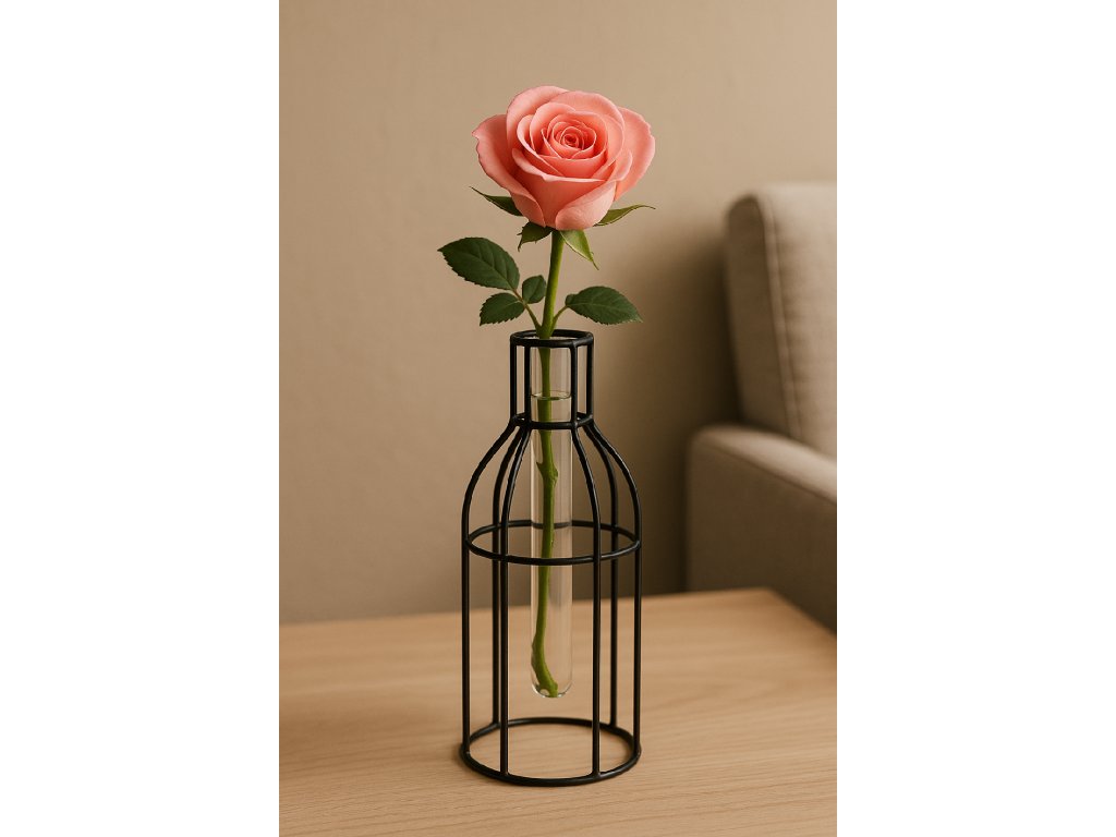 Stylová vázička se stojanem kombinuje jemné sklo a pevný kov. Skleněná část je ve tvaru zkumavky, zasazená do kovové konstrukce připomínající láhev. Vhodná pro řezané květiny, dekorativní větvičky nebo jako originální interiérový prvek.