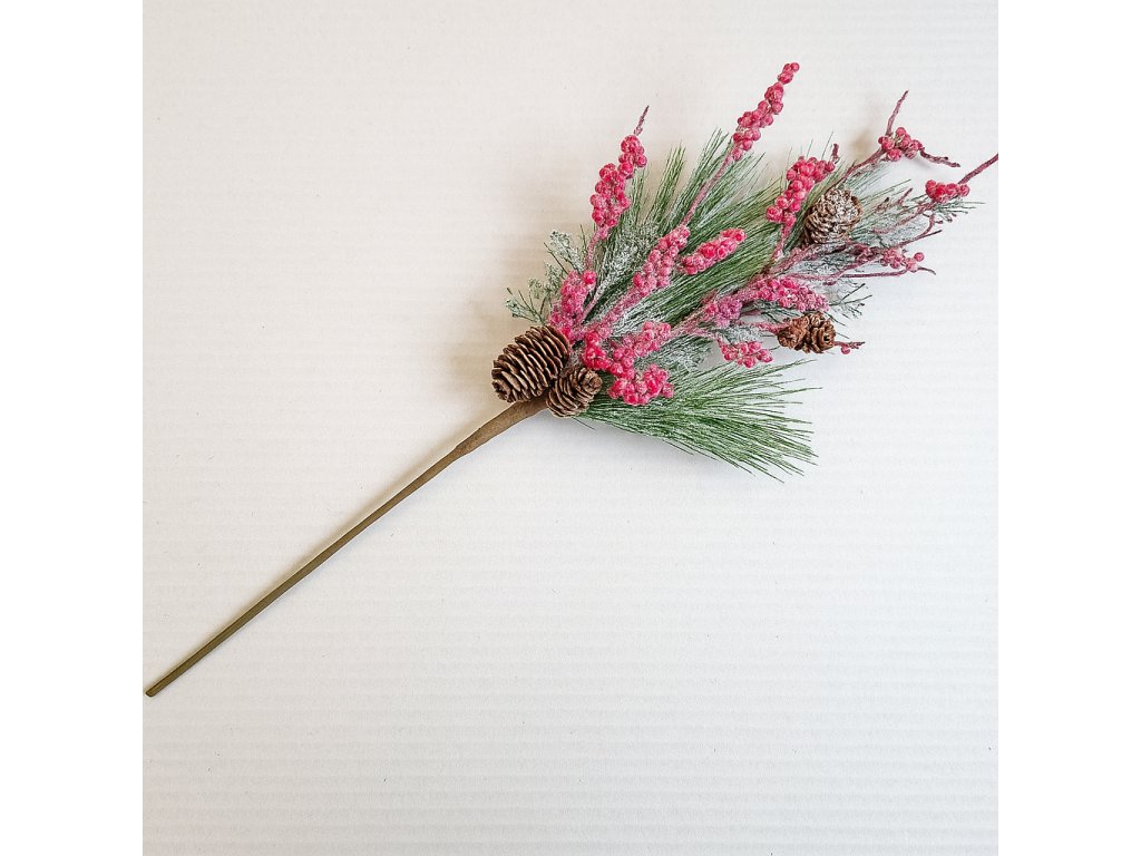 Tato vánoční větev působí přirozeně díky kombinaci jemného jehličí, různě velkých bobulí a přírodních šišek. Dlouhý stonek umožní snadné zapíchnutí do aranžovací hmoty či osazení do vázy. Větvičky lze lehce dotvarovat a přizpůsobit kompozici.