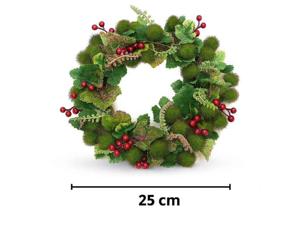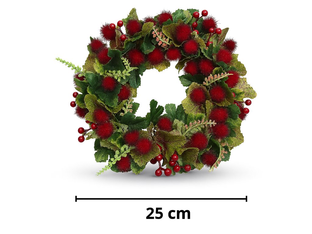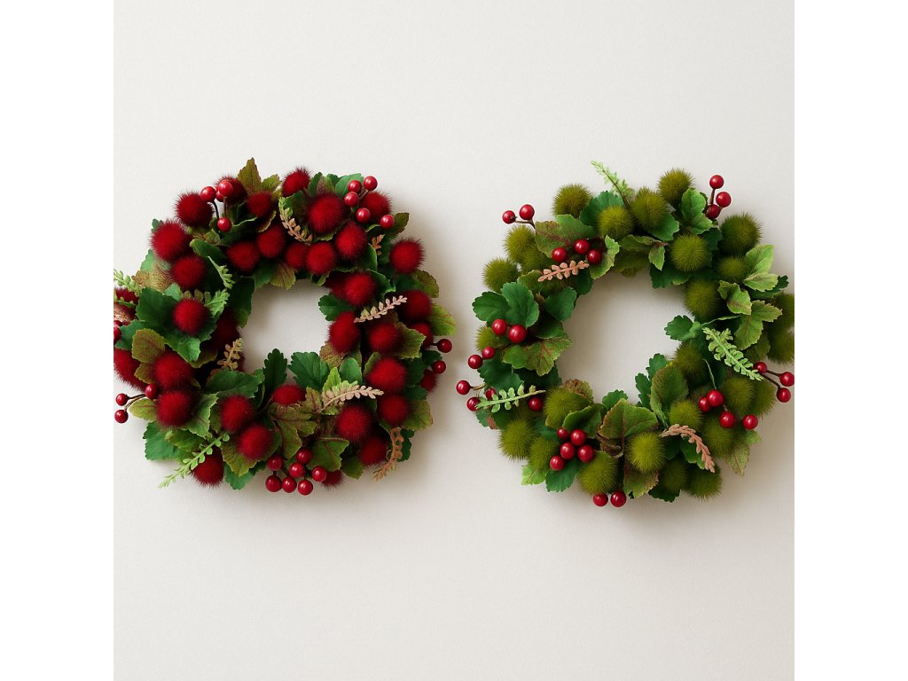 Věnec s chlupatými kuličkami, červenými plody a listy - 2 varianty