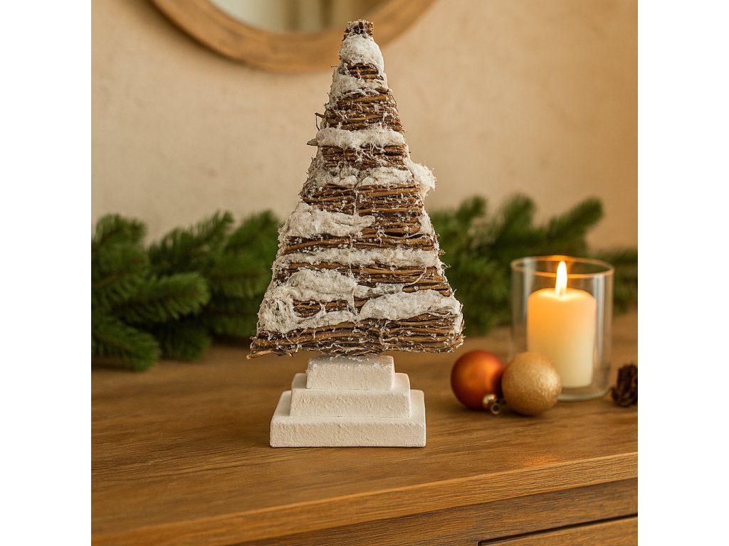 Stromek je usazen na bílém stupňovitém podstavci ze dřeva, který zajišťuje stabilitu.