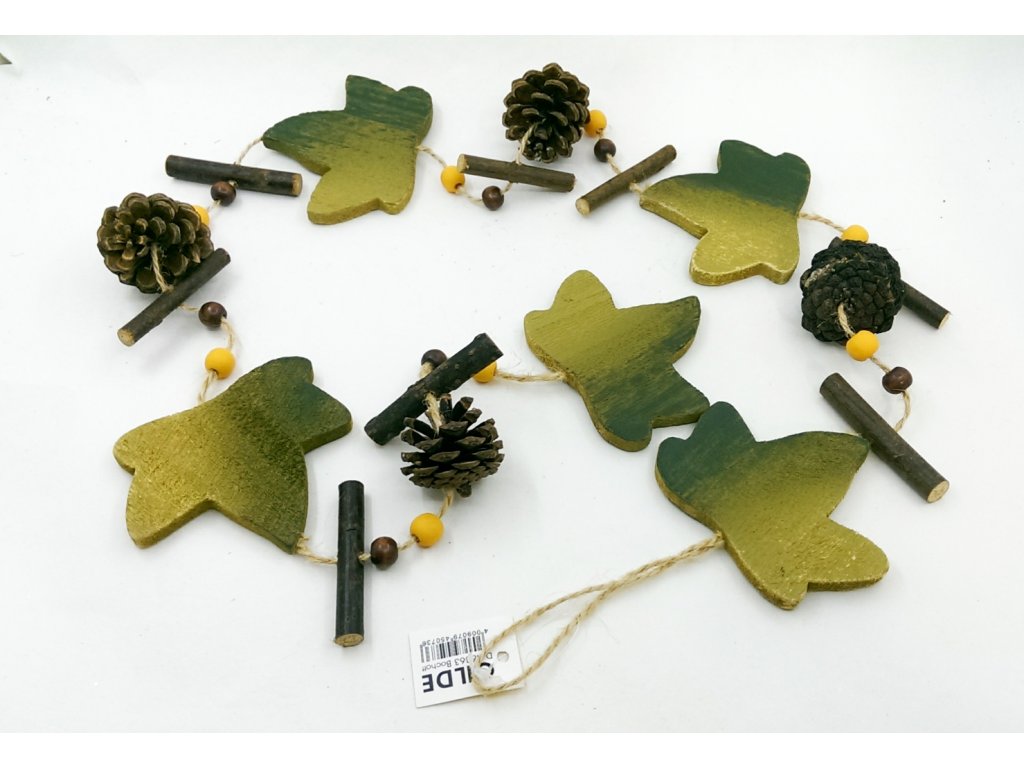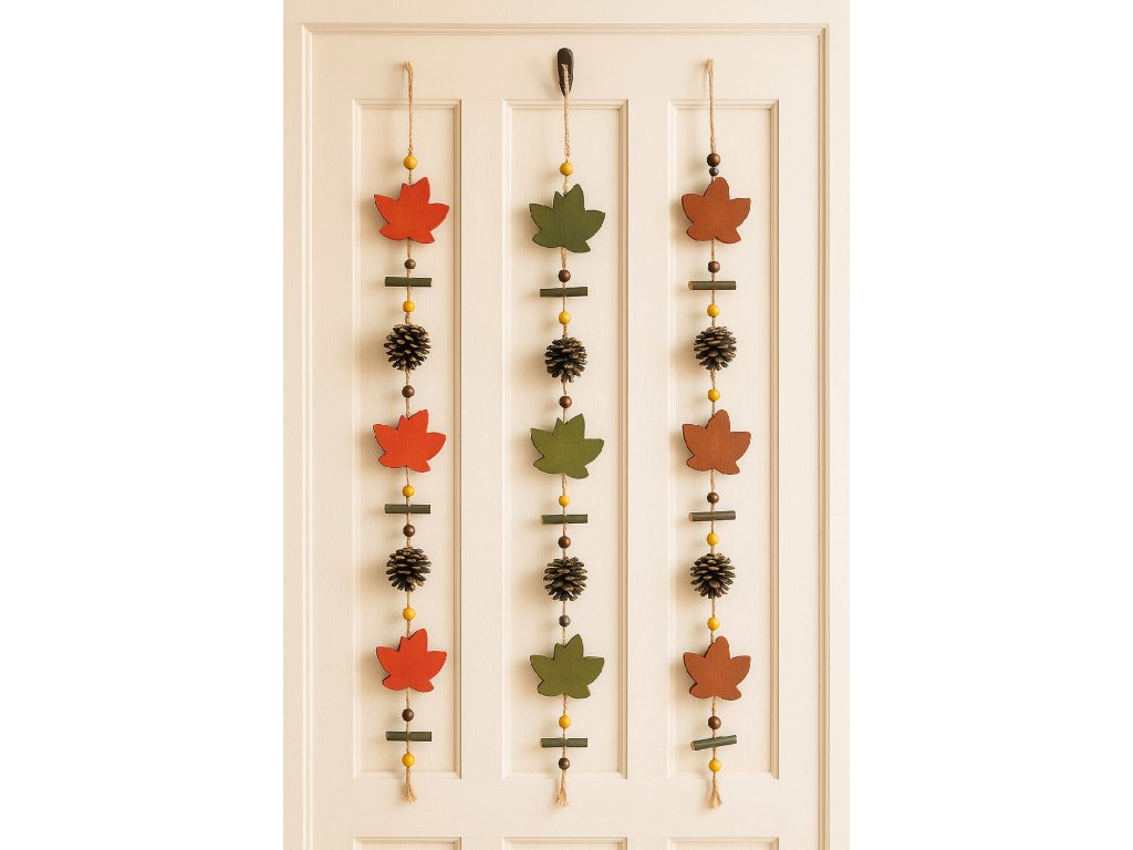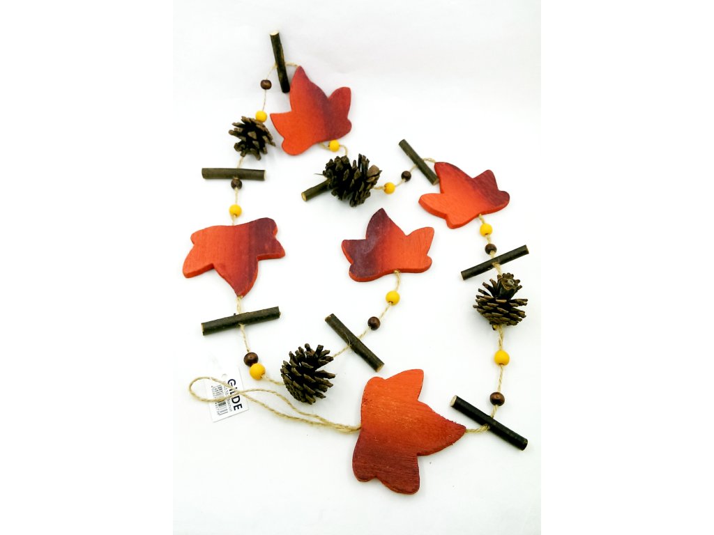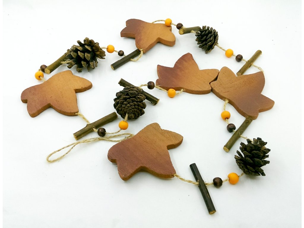 Tento přírodní podzimní závěs vnese do vašeho domova hřejivou atmosféru babího léta. Kombinace dřevěných javorových listů, přírodních šišek a malých dřevěných korálků působí autenticky a originálně.