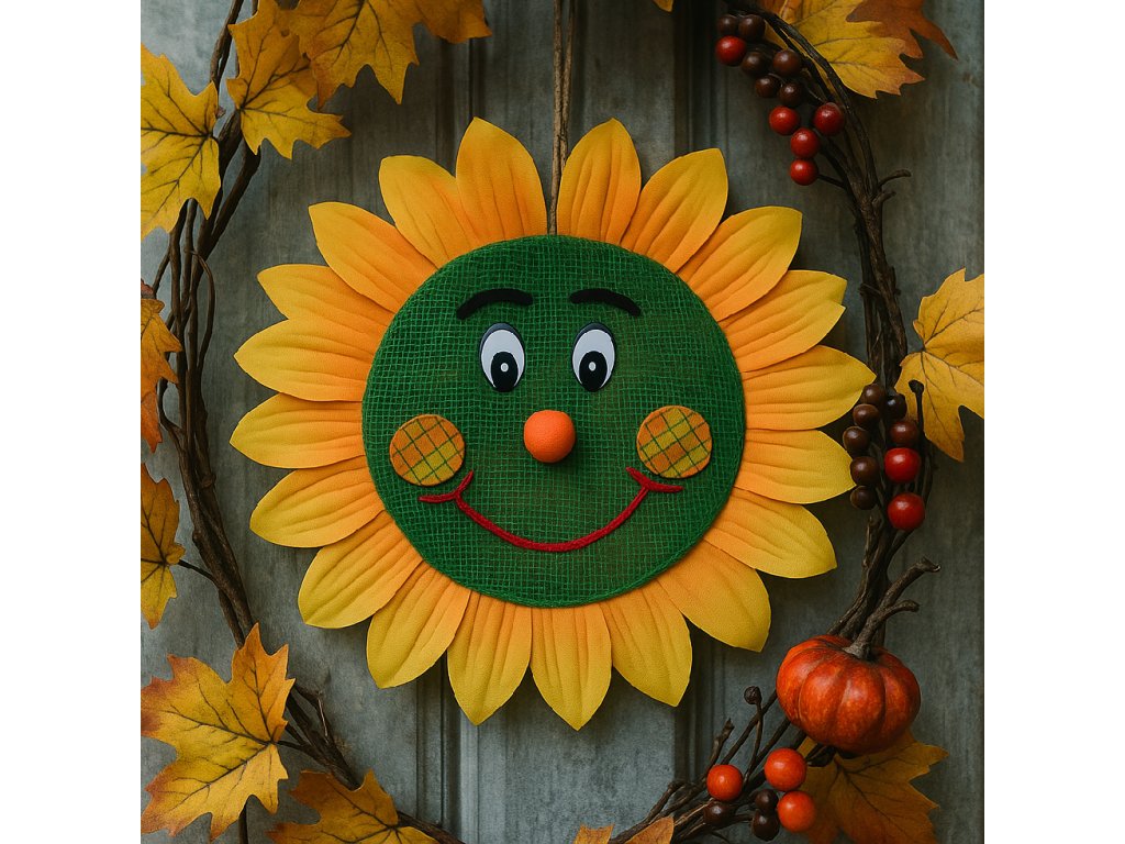 Dekorace sluníčko působí hravě a optimisticky díky kombinaci žlutých okvětních lístků a zeleného středu s veselým výrazem. Barevné detaily v podobě oranžového nosu a kostičkovaných tvářiček dodávají dekoraci šmrnc. Zavěšuje se snadno pomocí provázku, takže ji umístíte kamkoli – na dveře, stěnu, pergolu či do interiéru.