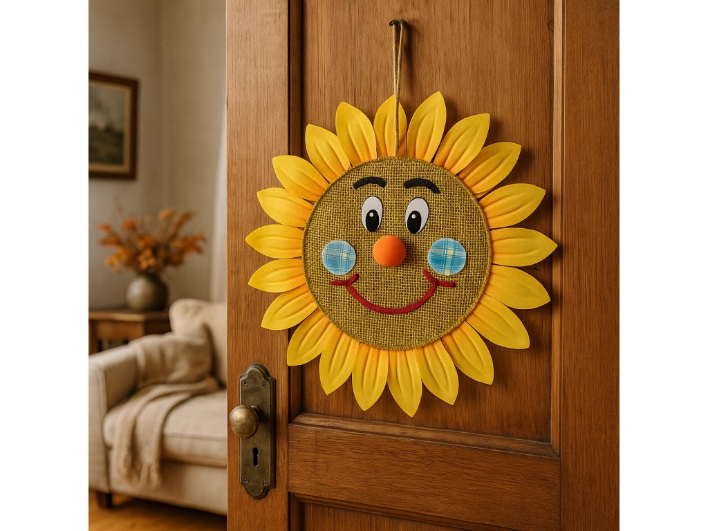 Dekorace sluníčko působí radostně a optimisticky díky kombinaci žlutých okvětních lístků, výrazného úsměvu a roztomilých detailů, jako jsou kostkované tvářičky a kulatý nos. Zavěšuje se pomocí pevného provázku, takže ji snadno umístíte na dveře, stěnu, pergolu nebo do dětského pokoje.