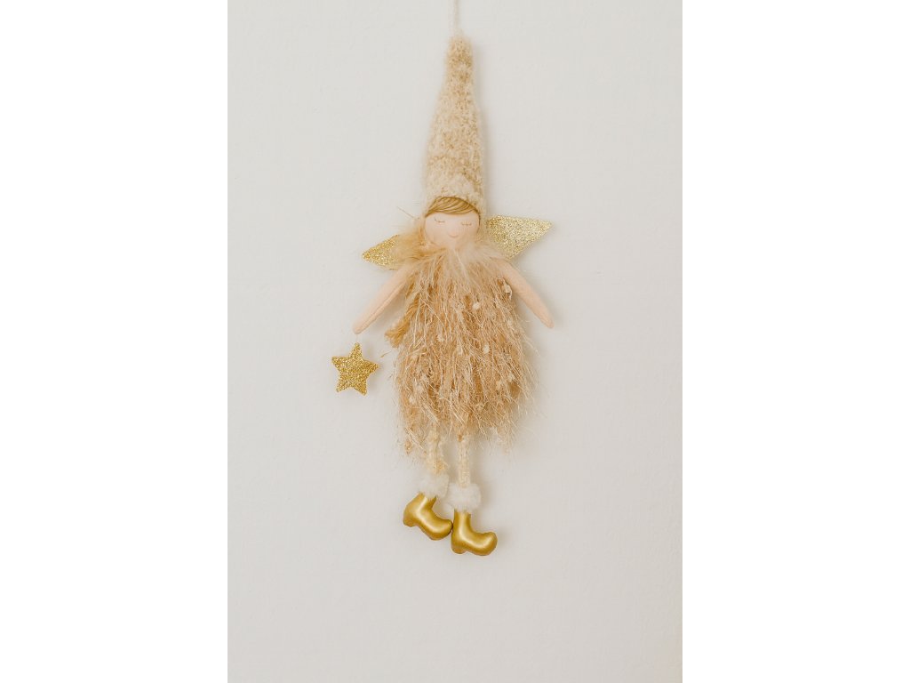 Tato závěsná vánoční víla je kombinací textilních materiálů a keramických prvků. Její výrazným prvkem je vysoká čepice, zlatá křídla a drobná hvězdička v ruce. Jemné detaily a hebké šaty s leskem působí slavnostně a pohádkově. Vílu můžete zavěsit na stromeček, okno, větev ve váze nebo ji využít jako doplněk do zimního aranžmá.