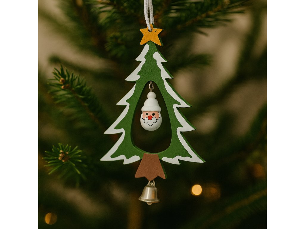 Závěsná dřevěná ozdoba ve tvaru zeleného stromečku s hvězdou, uvnitř s pohyblivou dřevěnou hlavičkou Santy na kovovém očku. Spodní část doplňuje malý kovový zvoneček pro jemné cinknutí. Zavěšení zajišťuje bílý bavlněný provázek se zeleným dřevěným korálkem; zadní strana stromečku je čistě zelená. Vhodné na stromek, větvičky i věnec.