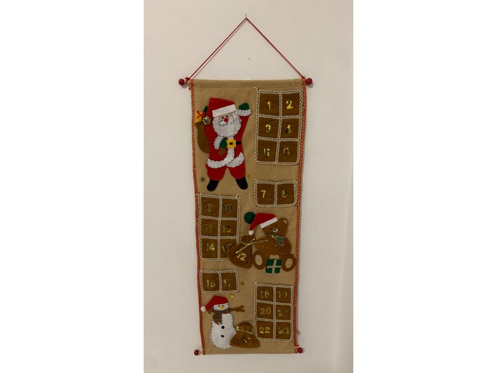 Textilní závěsný adventní kalendář v přírodním stylu s motivy Santy, medvídka a sněhuláka. Má 24 přihrádek na malé dárky nebo sladkosti. Zlatá čísla jsou rozložena chronologicky – 1 až 23 na kapsičkách, výjimky 12 a 24 na pytlíčcích. Pečlivé zpracování, ozdobné lemy a dřevěné detaily z něj dělají výraznou, ale klidnou dekoraci do bytu. Snadno se zavěsí na zeď, dveře nebo komodu.