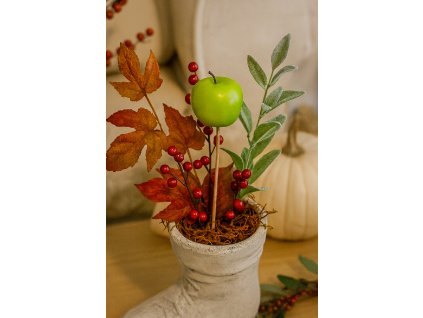 Podzimní zápich s jablíčkem odrůdy Golden Delicious působí svěže a přirozeně. Kombinace zeleného jablka, červených bobulek a listů v teplých podzimních odstínech vytváří harmonickou dekoraci vhodnou do květináče, věnce nebo vázy. Dlouhá špejle umožňuje snadné zapíchnutí do aranžovací hmoty či substrátu. Výborně doplní sezónní výzdobu s dýněmi, šiškami a dalšími přírodními prvky.