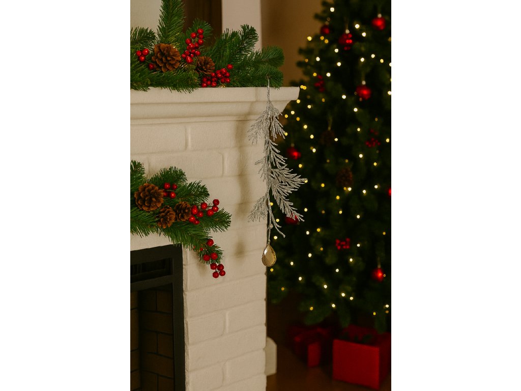 Tato elegantní třpytivá větvička působí slavnostně a díky jemnému lesku krásně odráží světlo svíček i vánočních řetězů. Spodní část je zdobena průhledným broušeným krystalem, který dodává dekoraci luxusní efekt.