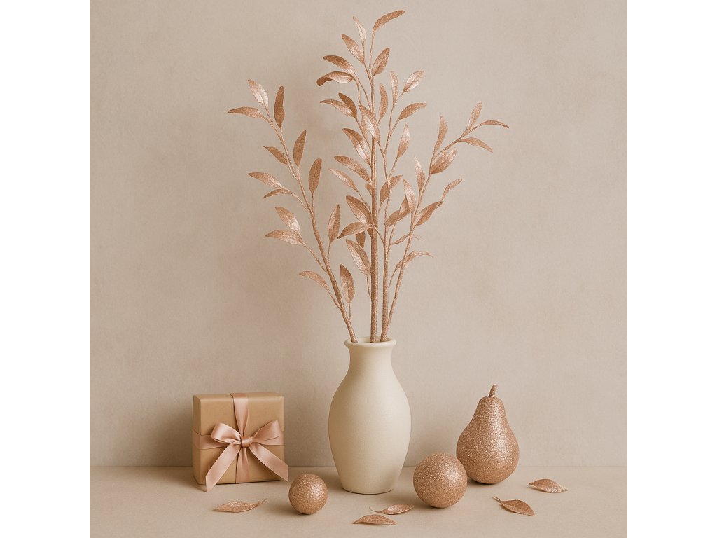 Plastová větvička s jemnými zlatorůžovými listy o délce přibližně 115 cm. Díky ohebnému drátku uvnitř stonku ji lze snadno tvarovat a přizpůsobit výšce vázy či typu aranžmá. Jemný perleťový povrch s drobnými třpytkami dodává dekoraci luxusní nádech, aniž by působila přehnaně leskle.