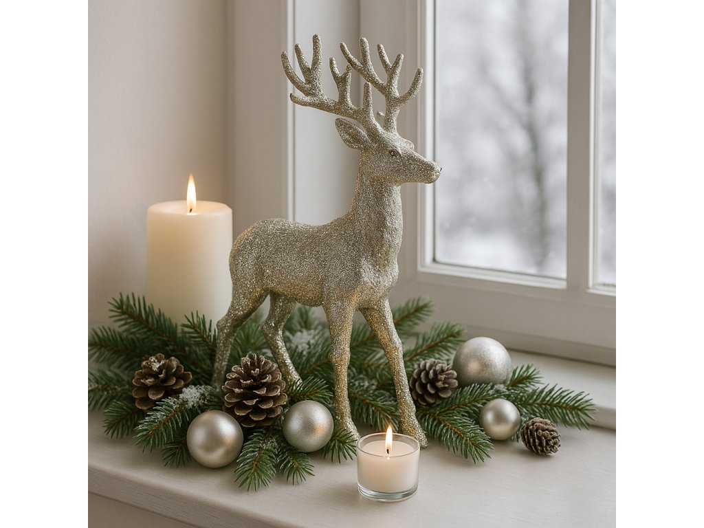 Tento sob ve zlatém provedení se stane výrazným prvkem každého vánočního aranžmá. Díky bohatému třpytu krásně odráží světlo a působí luxusním dojmem. Vhodný je jako solitér na skříňku, parapet nebo stůl, ale i jako součást větší sváteční kompozice.